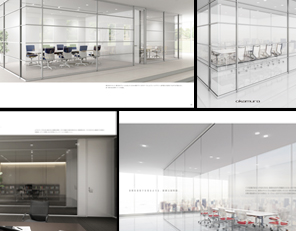 繊細なフレームデザインとディテールの追求により生まれた、 美しいがラスパーテーション「safe wall G-AXIS」。 そのカタログ制作にあたっては、CGチームと連携し、 「空気の様な存在感」「流れるフレームライン」 「際立つガラスの美しさ」をテーマに、 オフィスレイアウトを具現化、事例写真に留まらない、 空間CGのイメージングに成功した。