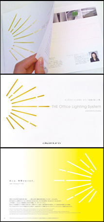 光を感じる感受性「サーカディアンリズム」に則った画期的なオフィス照明「次・オフィスライトシステム」の発売に際し、今までにない切り口のカタログが求められた。そこで、商品コンセプトである光を手にとって感じられるように、表紙から続く3ページ分を型抜きし、裏面のグラデーションを対向する白場に反射させ、色を感じさせる紙面に。
