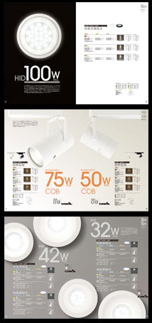 それまでの総合カタログから、店鋪向けLEDに特化したカタログの制作依頼。様々な商環境に応えられる品揃えと確かな品質をダイレクトに伝えるため、製品を原寸大かそれに近いサイズで紹介している。